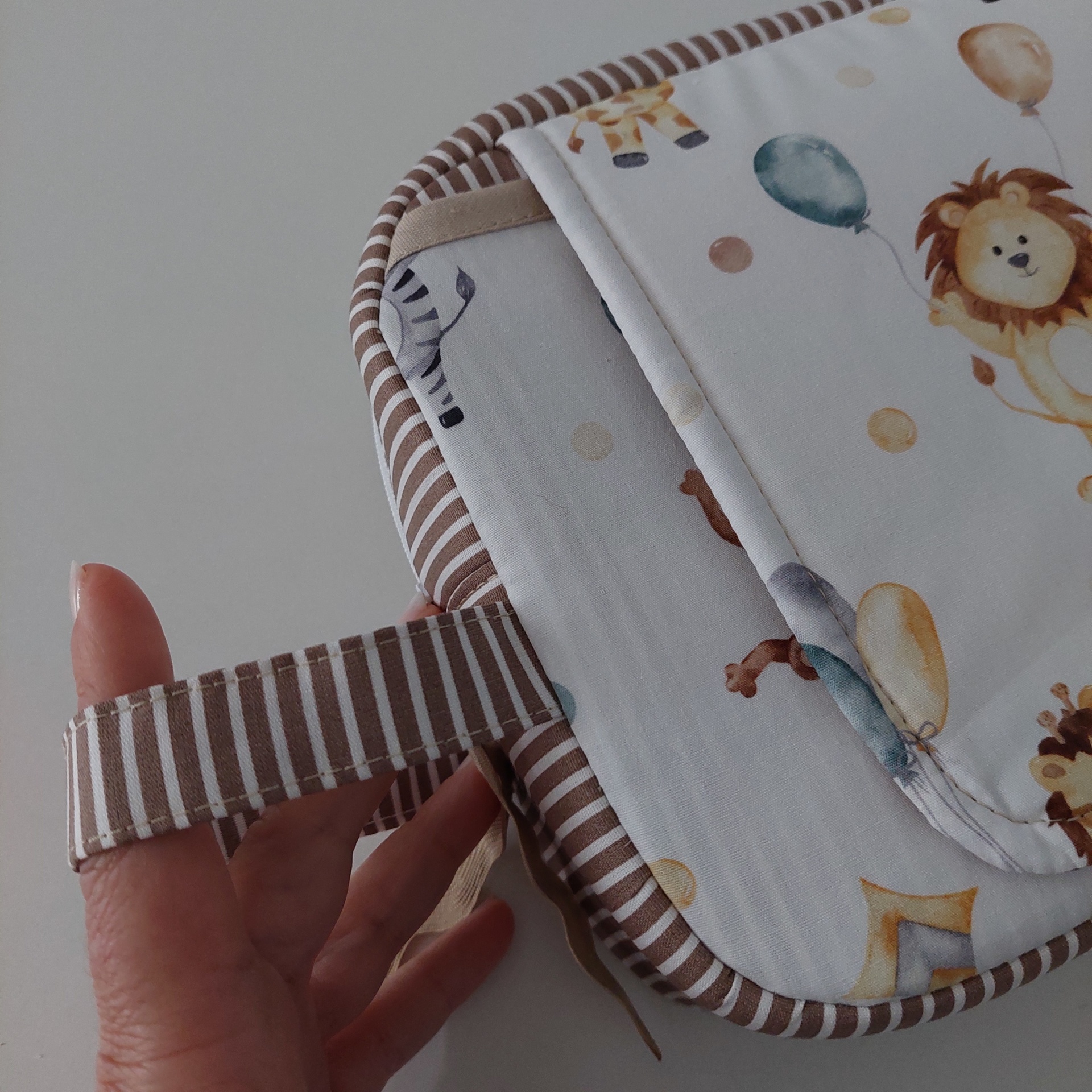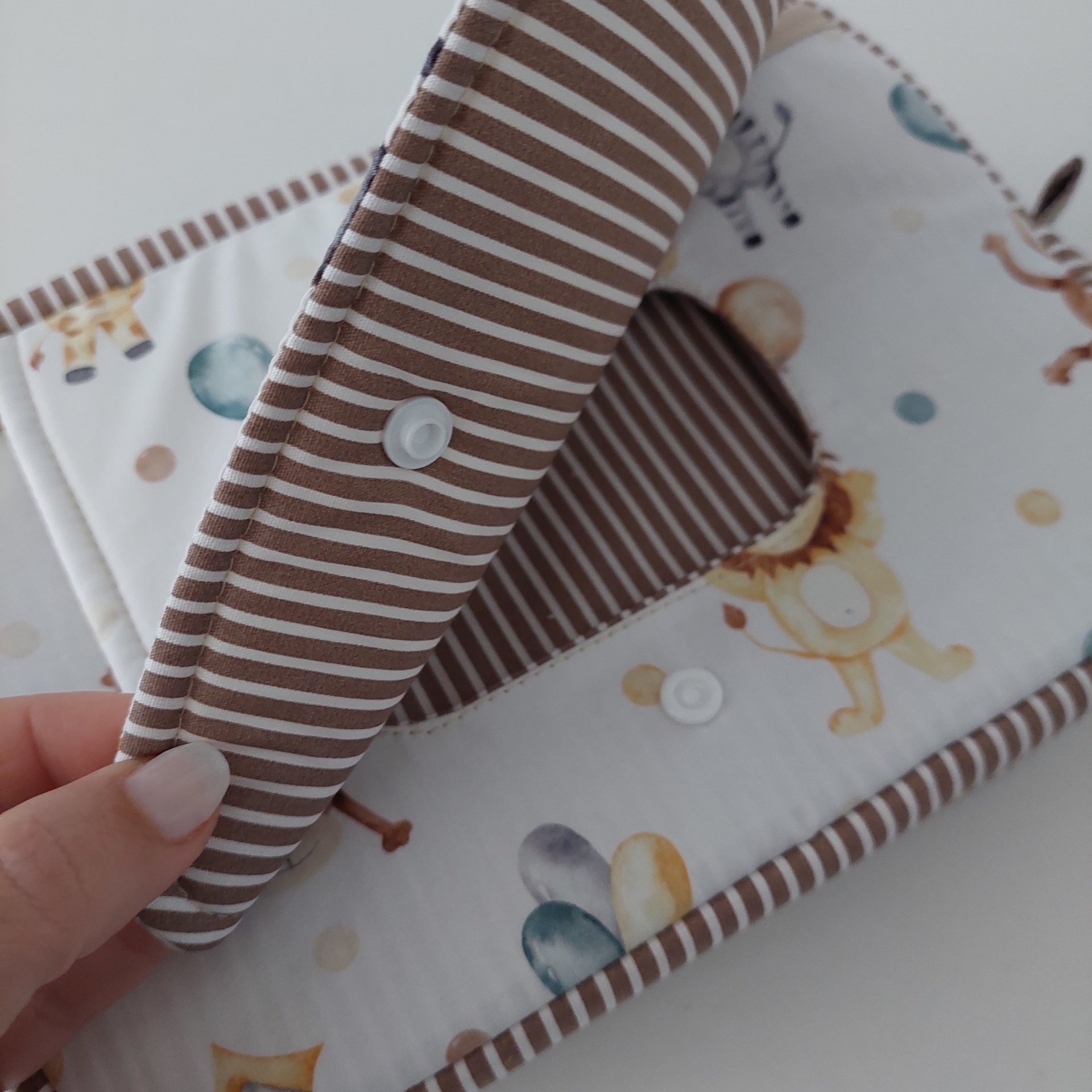 *Totalmente estruturada, com bolso de aba para toalhitas; bolsa com fecho para colocar fraldas(no ateliê tenho o tamanho 4 de fraldas e cabem 8 fraldas ) e o creme; bolso traseiro em vinil com fecho para colocar compressas, soro fisiológico ,termómetro ou se preferir o seu telemóvel ou do boletim de saúde do seu bebé.