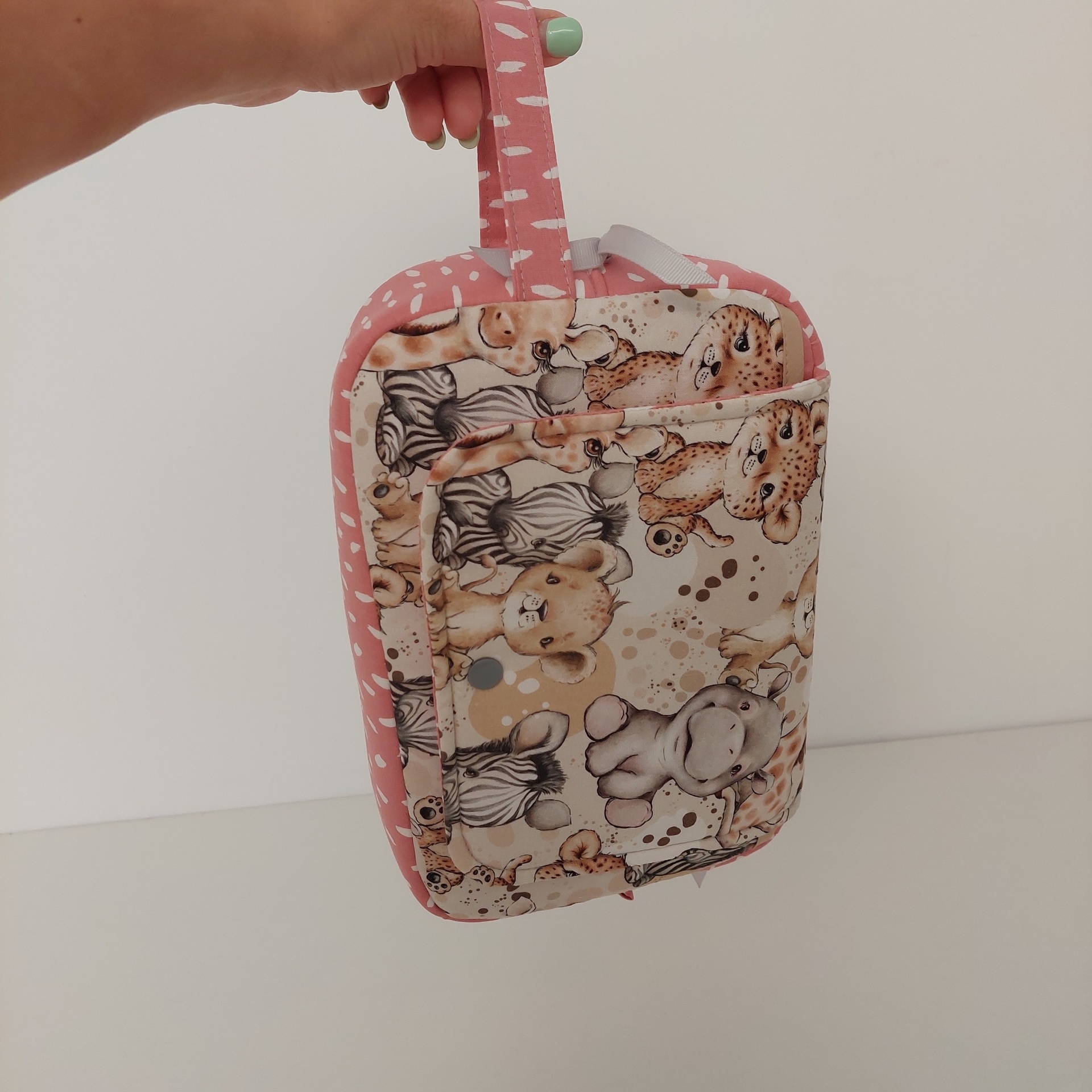 *Totalmente estruturada, com bolso de aba para toalhitas; bolsa com fecho para colocar fraldas(no ateliê tenho o tamanho 4 de fraldas e cabem 8 fraldas ) e o creme; bolso traseiro em vinil com fecho para colocar compressas, soro fisiológico ,termómetro ou se preferir o seu telemóvel ou do boletim de saúde do seu bebé.